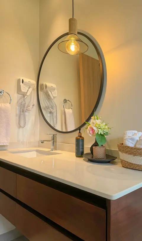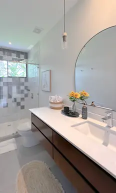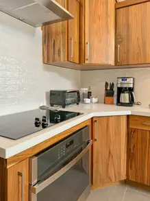 Outside on the covered terrace, you’ll find a bar with a big ice chest cooler, a sink, and 4 bar seats. There’s also a Kamado charcoal grill for spectacular tasting meat and veggies. Soak in the sun on the lounge chairs by the pool and cool off with a drink in the shade on the outdoor terrace sofas. For your convenience, there is an outdoor shower for an after-pool rinse, and a bathroom accessible from the pool and terrace area.